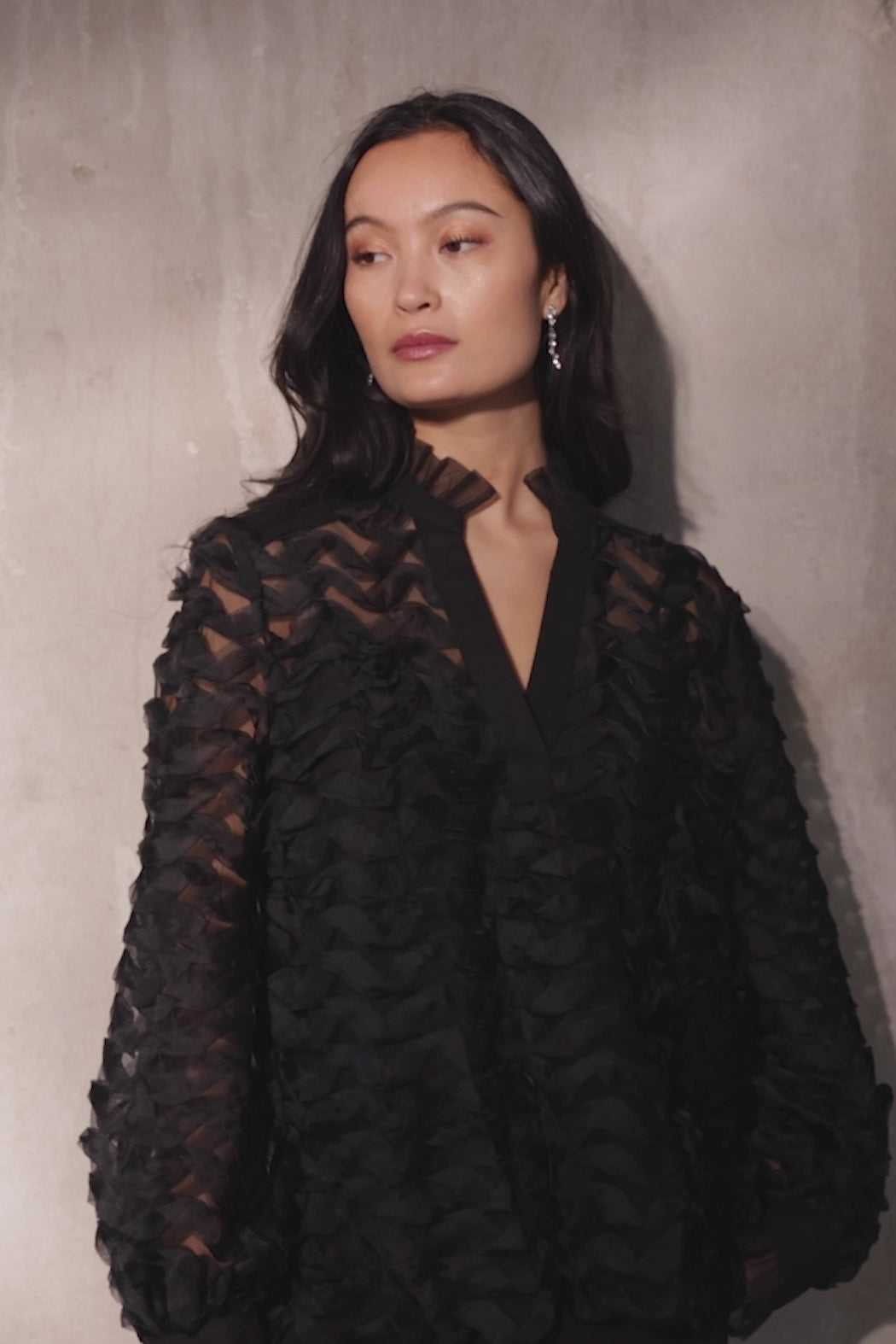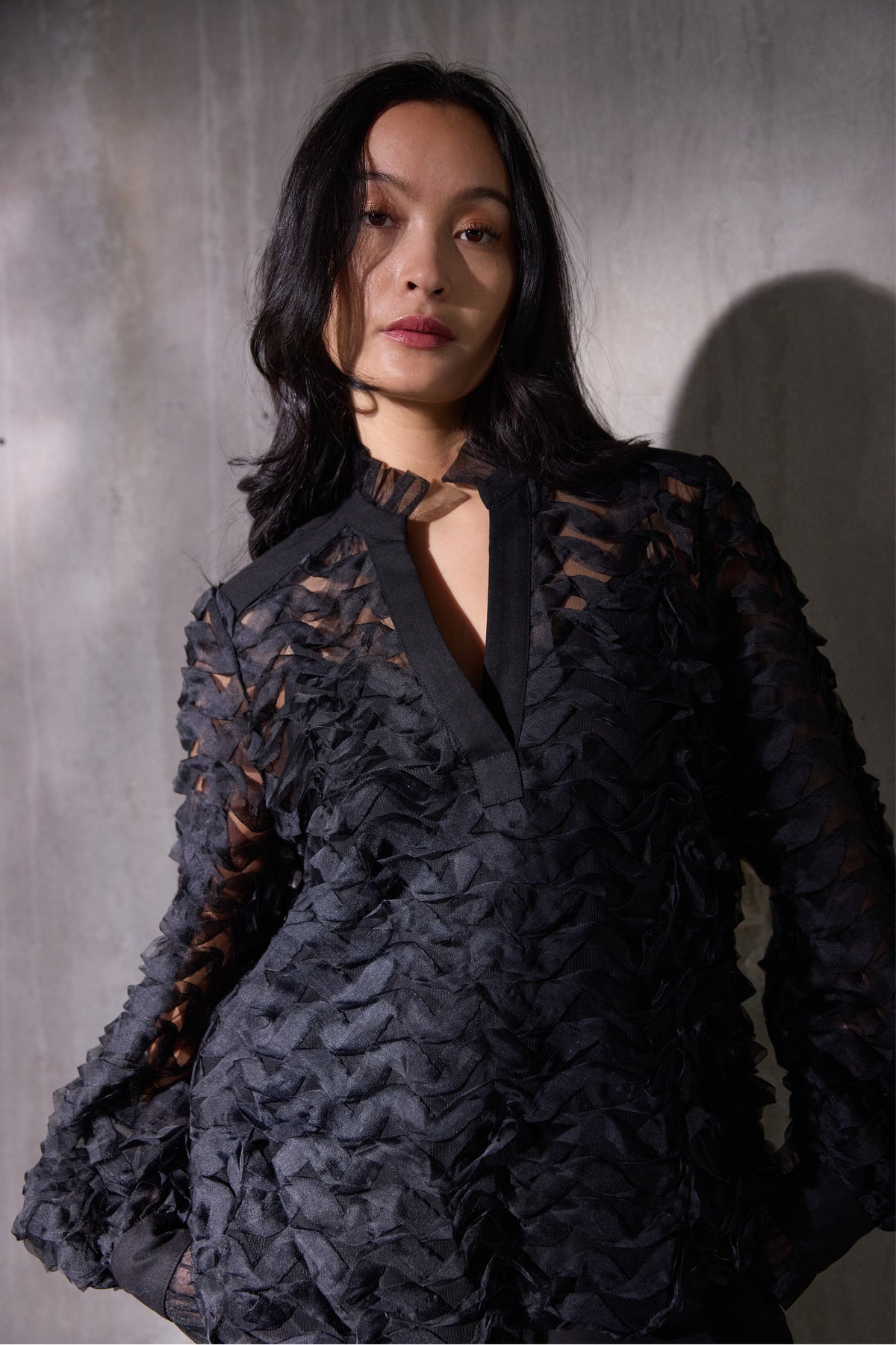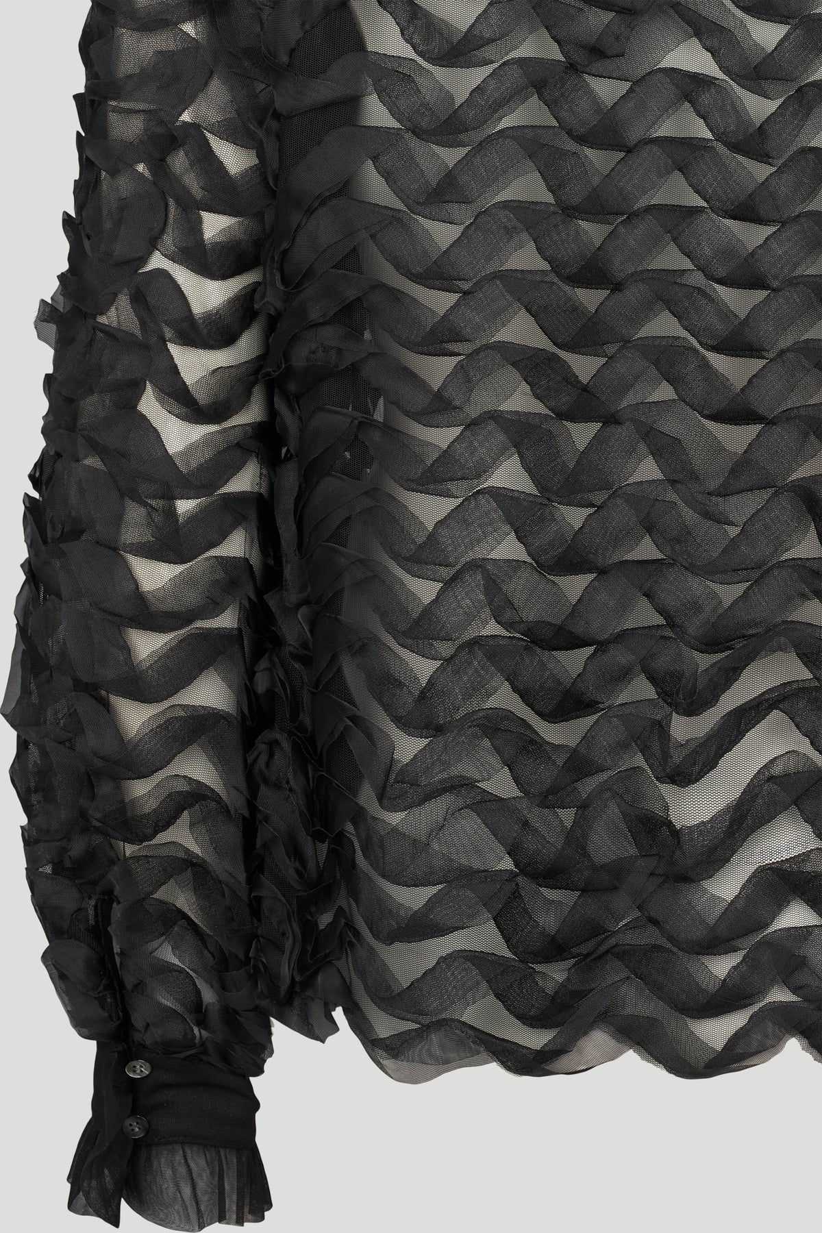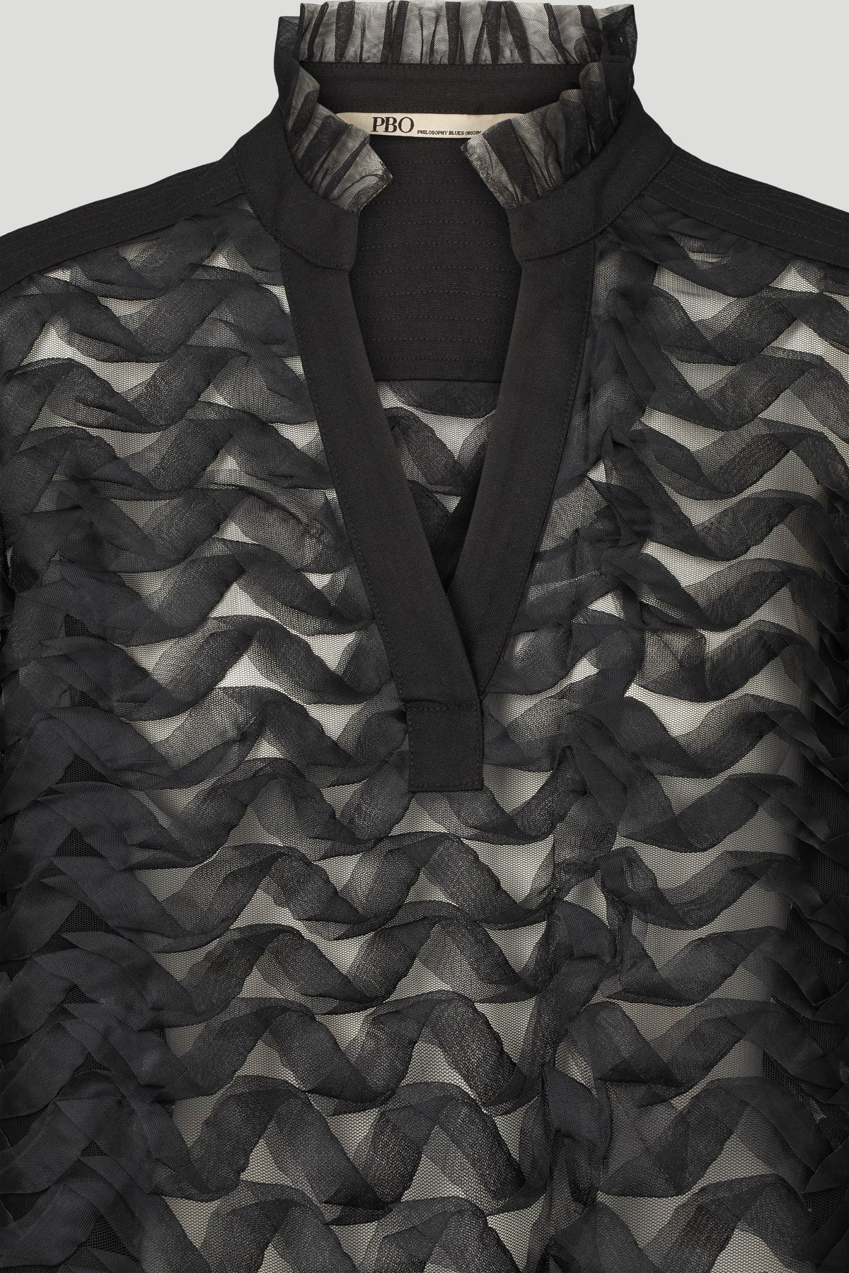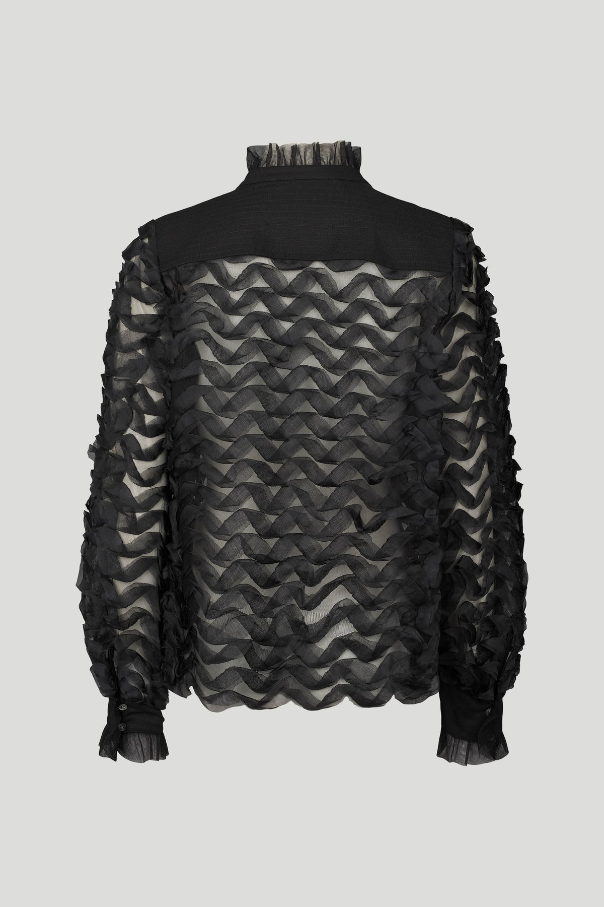 5187PBOBina bluse er en elegant statement-bluse, der kombinerer gennemtænkt tekstur med sofistikeret lethed. Det transparente materiale er udsmykket med lag-på-lag bølgeeffekter, der skaber en tredimensionel struktur og et levende udtryk. Den høje hals med plisserede detaljer samt manchetter med knaplukning understreger det feminine og eksklusive look.