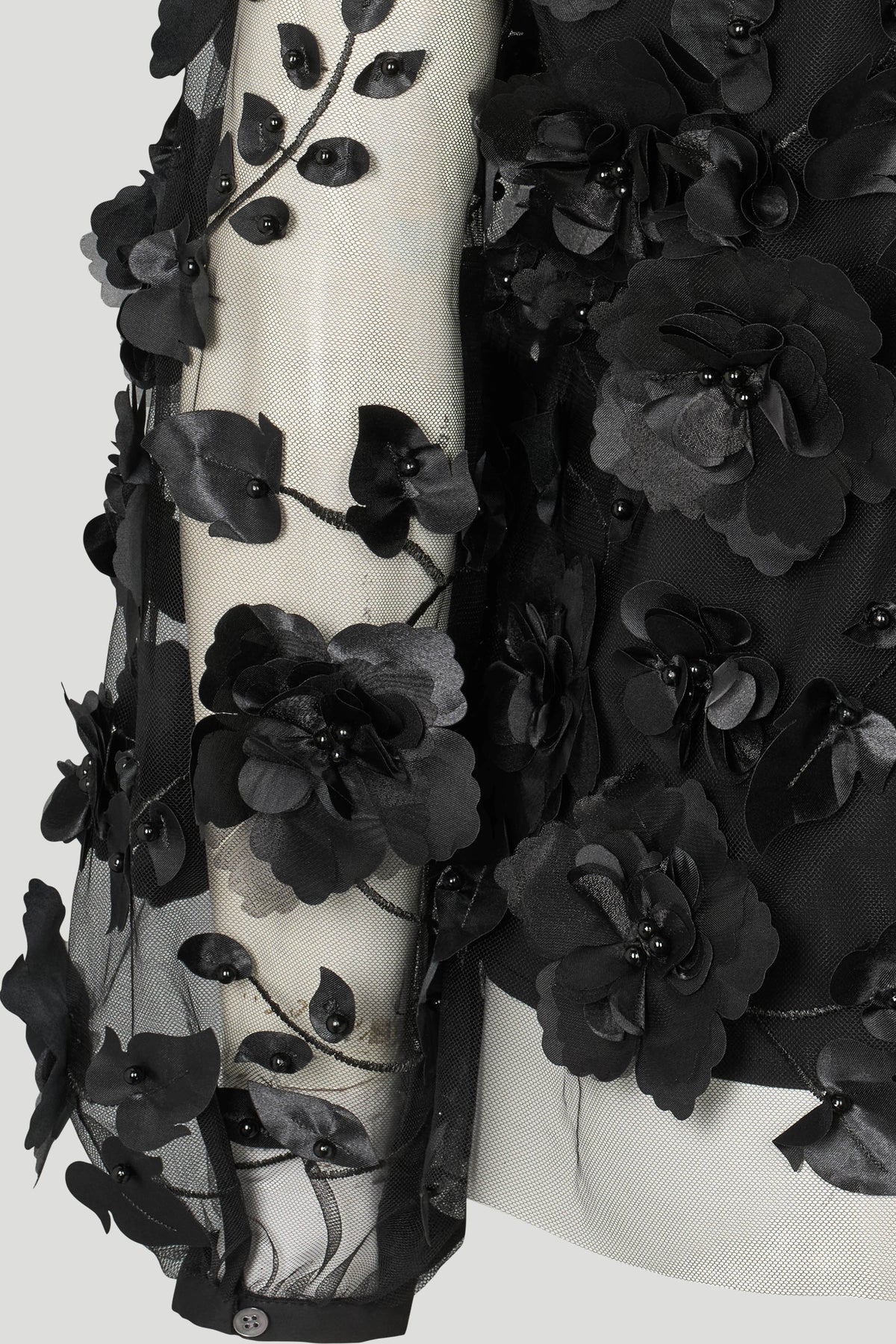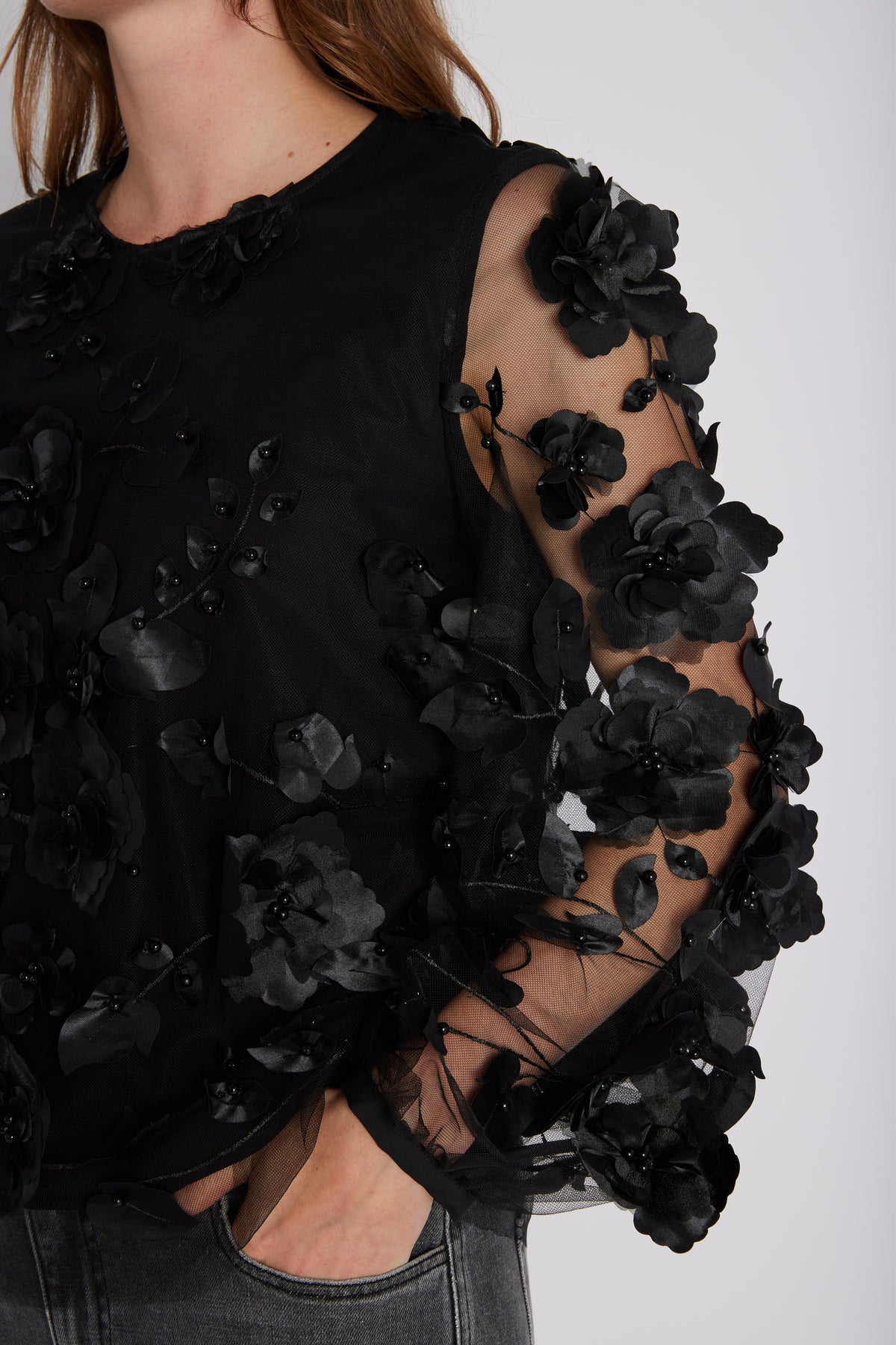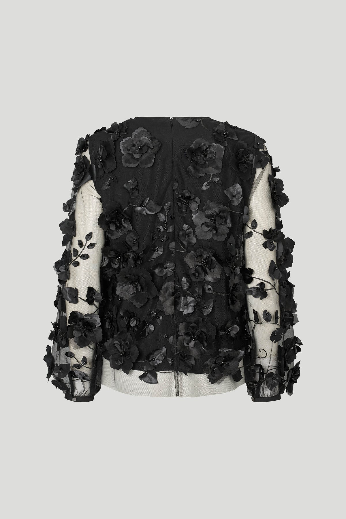 5108PBOGiron bluse er en sofistikeret bluse med transparente ærmer og rigt dekorerede 3D-blomsterapplikationer. Den lette pasform kombinerer komfort og eksklusivitet, hvilket gør den ideel til både festlige og elegante lejligheder.