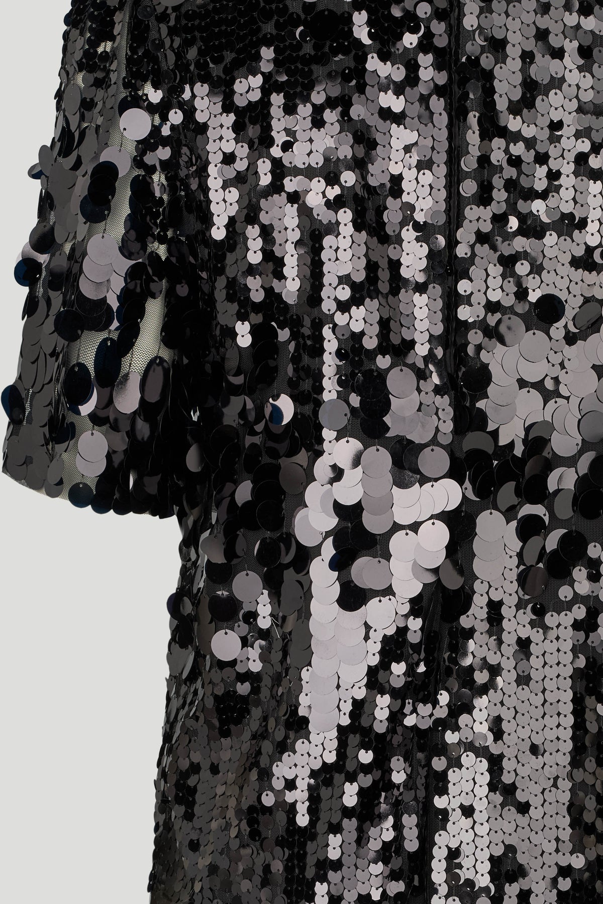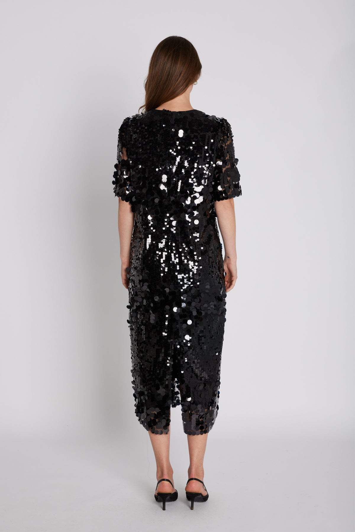 4382PBOFade kjole er en iøjnefaldende statementkjole, designet til at skabe et eksklusivt og glamourøst look. Kjolen er dækket af store, skinnende pailletter, der fanger lyset og giver et levende, dynamisk udtryk ved hver bevægelse. Den enkle, lige pasform med rund halsudskæring og korte ærmer gør, at palietterne får fuldt fokus, mens længden til under knæet sikrer et elegant og moderne snit.