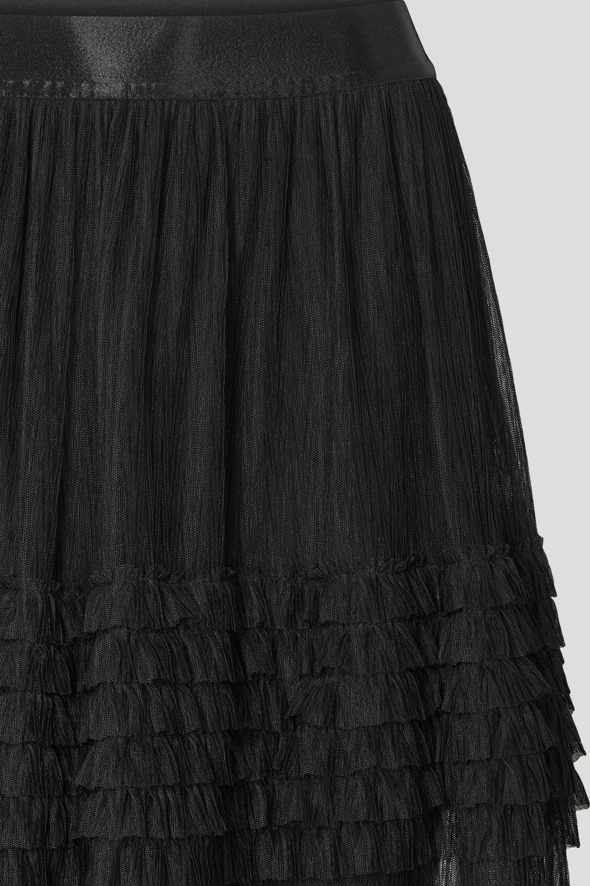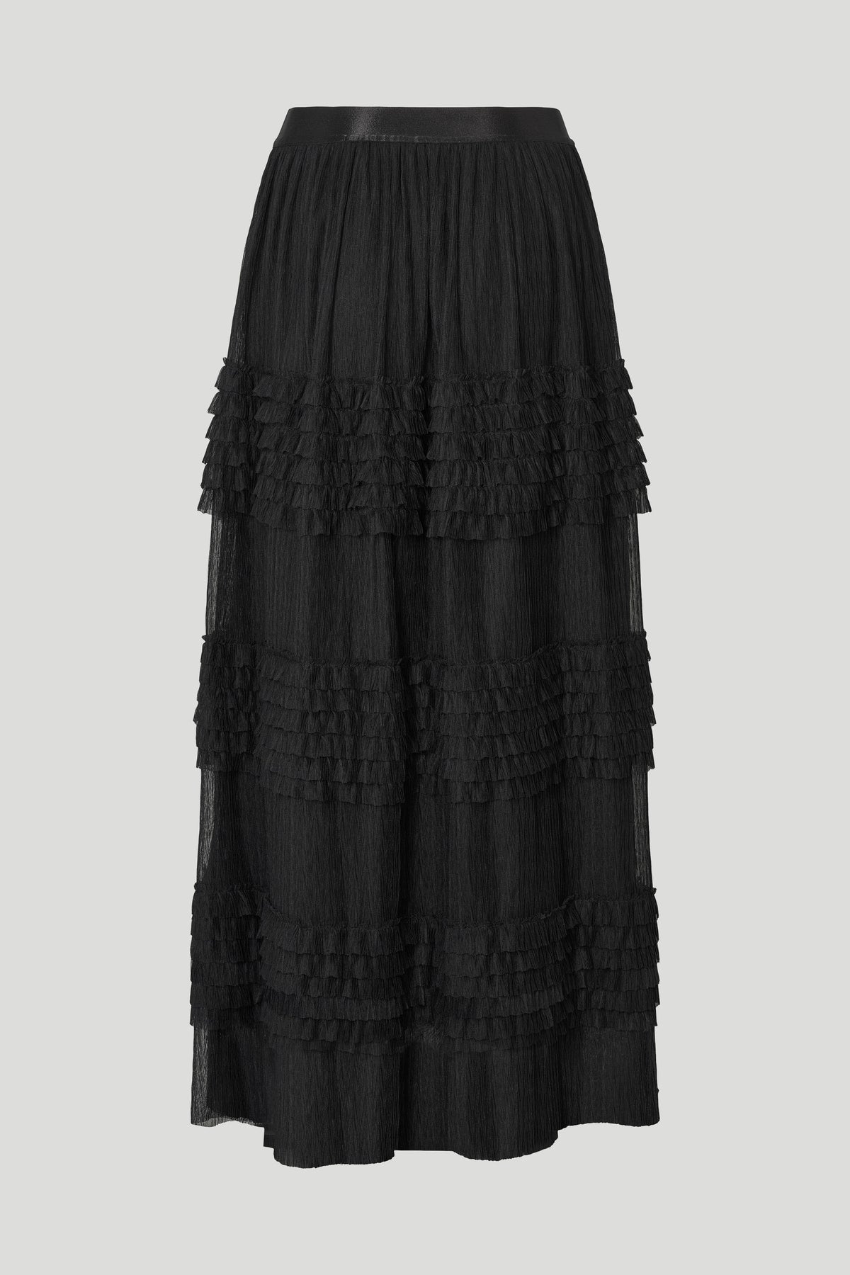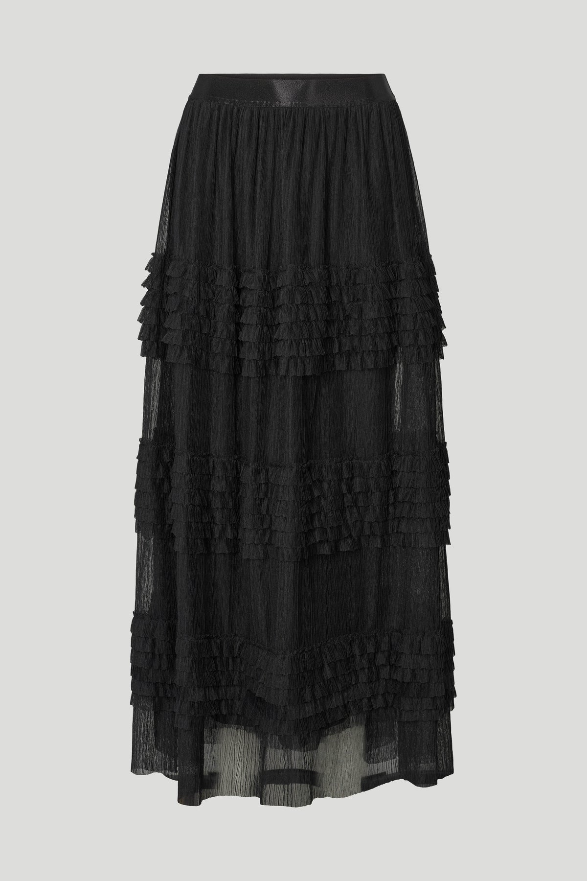 5186PBOAgate nederdelen er et iøjnefaldende statement-piece med lag af fine plisserede volanter, der skaber smuk bevægelse og lethed. Det feminine design kombineres med en elastisk linning, som giver en komfortabel pasform og gør den nem at style til både hverdag og fest.