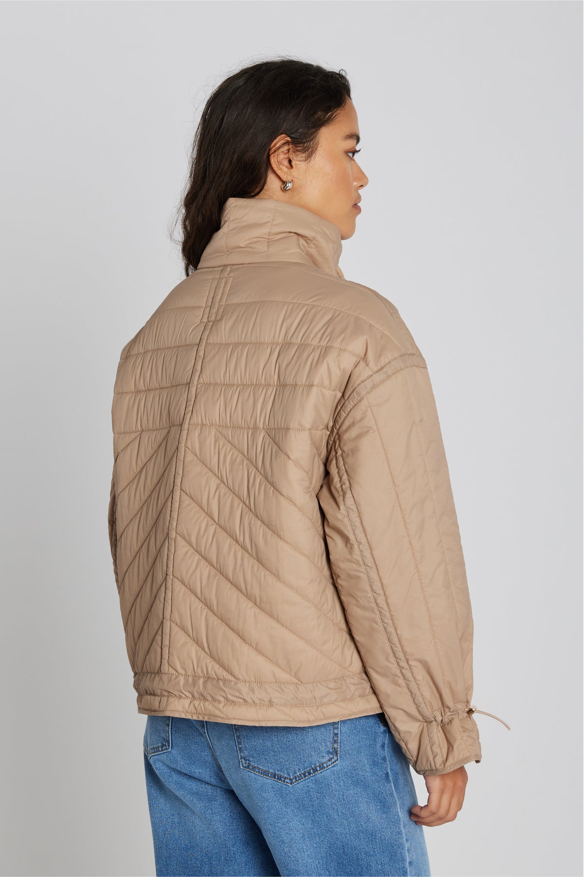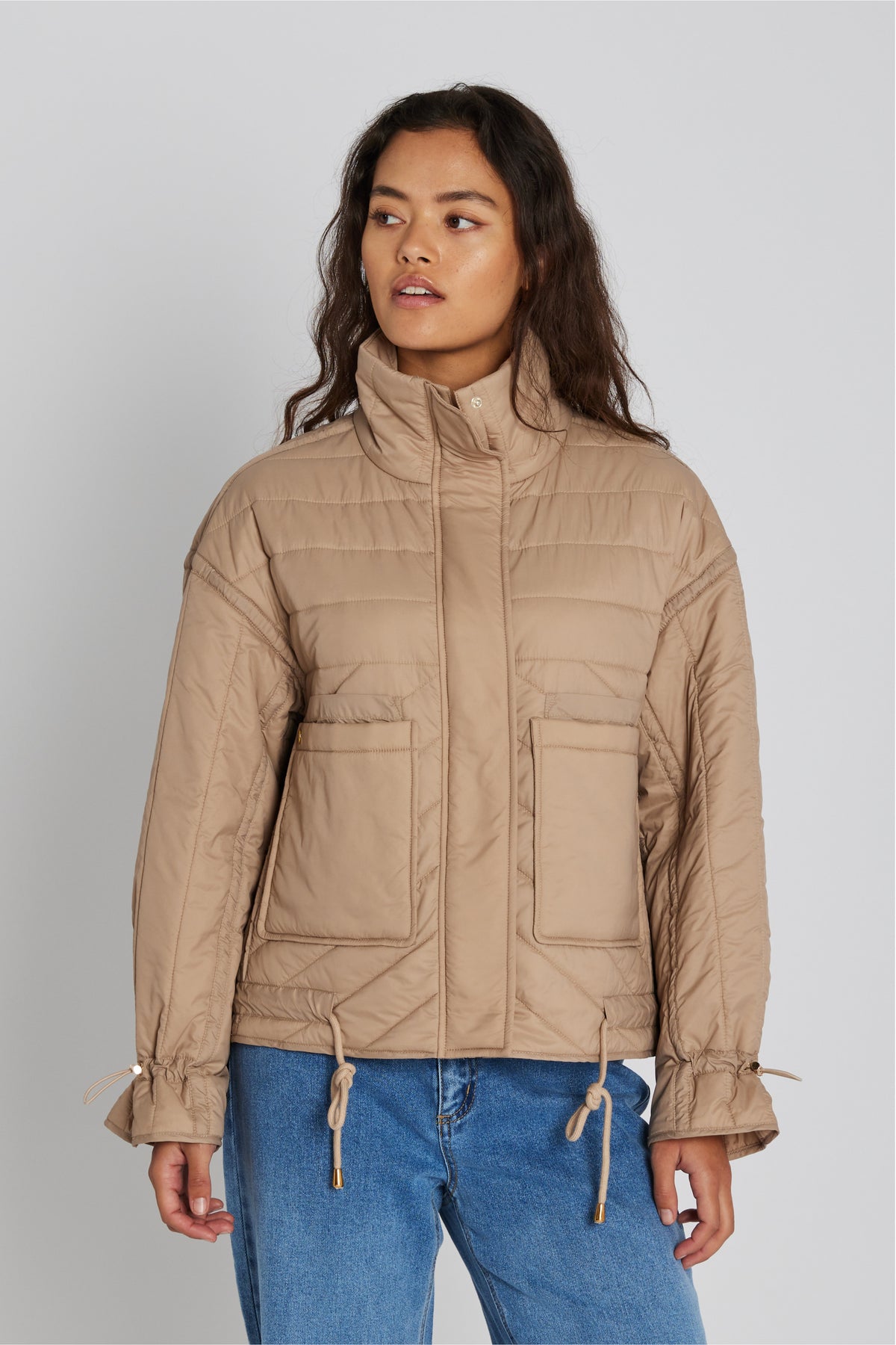 1575PBOFrida er en quiltet jakke med et moderne design og praktiske detaljer. Den høje krave og snore i både ærmekanter og forneden giver en justerbar pasform, mens de rummelige forlommer tilføjer funktionalitet.
