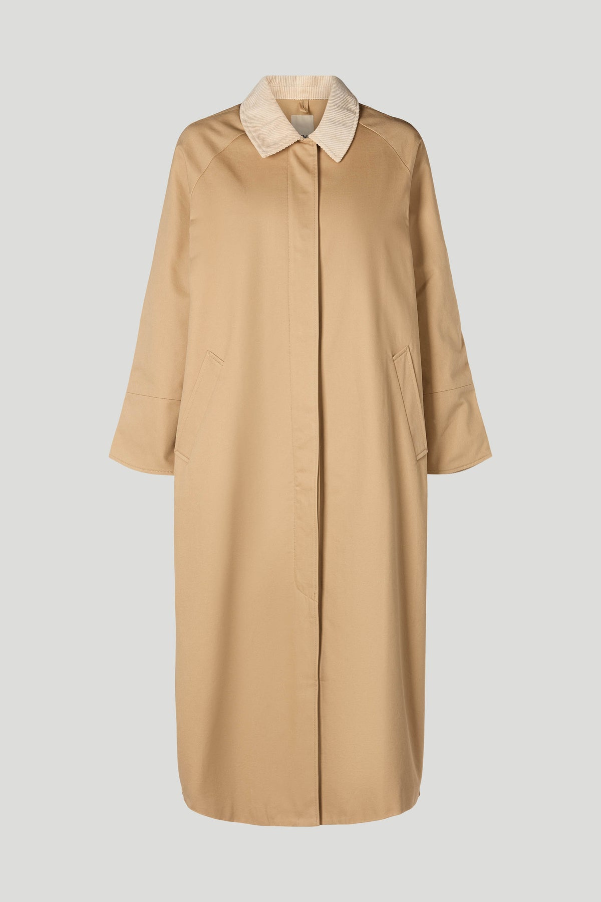 1500PBOTera frakke har en lang, rummelig silhuet med raglanærmer, skjult lukning og en kontrastkrave i bredriflet velour, som giver et elegant og moderne udtryk.