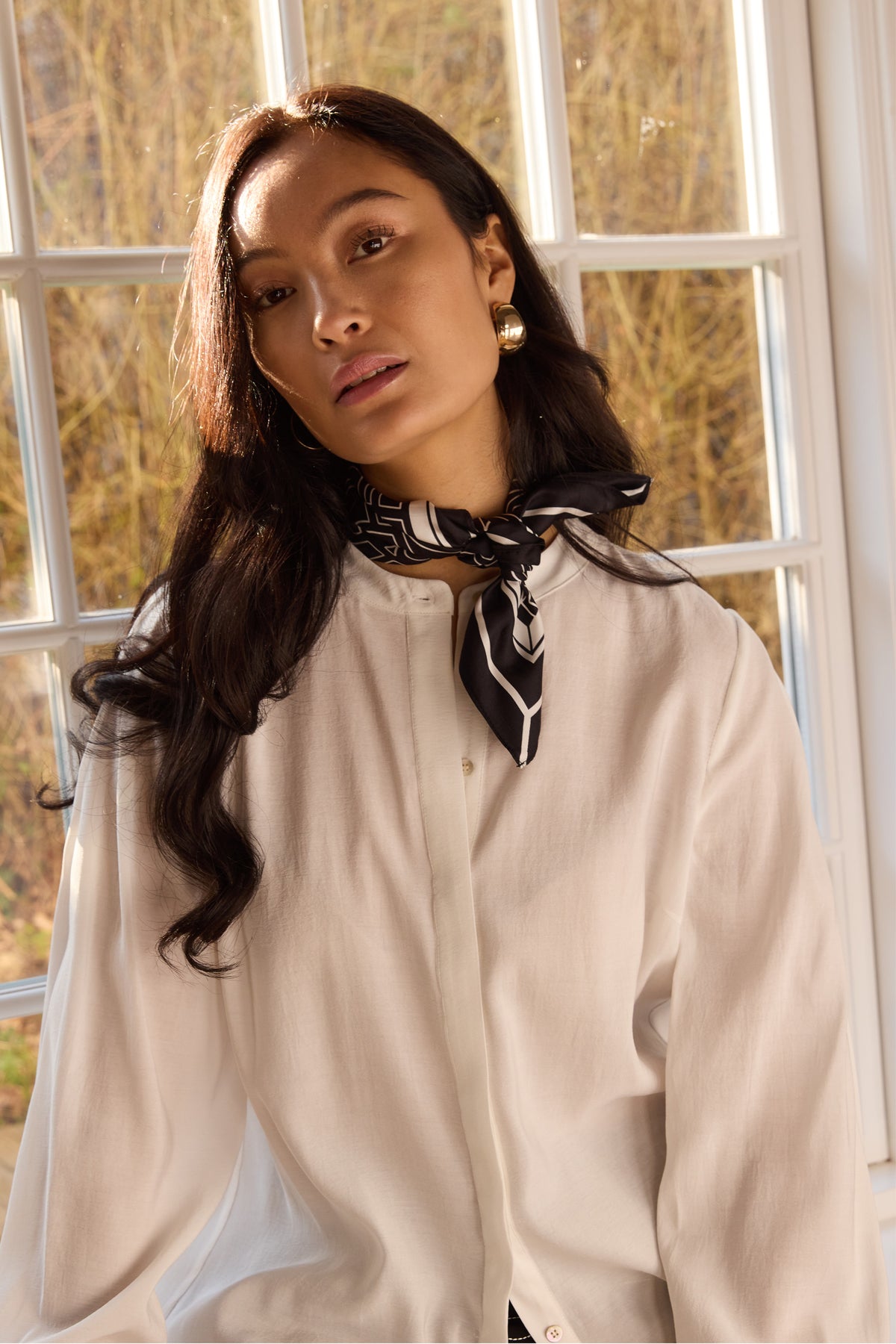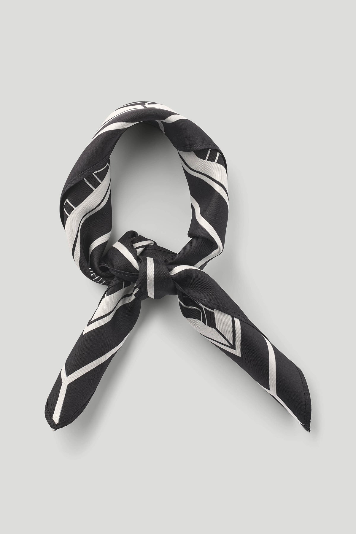 Tilføj et strejf af elegance til dit look med PBO’s lille silketørklæde. Designet i 100% silke med et eksklusivt monogramprint, der kombinerer klassisk sort og hvidt i et grafisk udtryk. Den glatte, blanke overflade giver et luksuriøst fald, og størrelsen gør det nemt at style tørklædet på mange måder – om halsen, i håret eller på tasken.