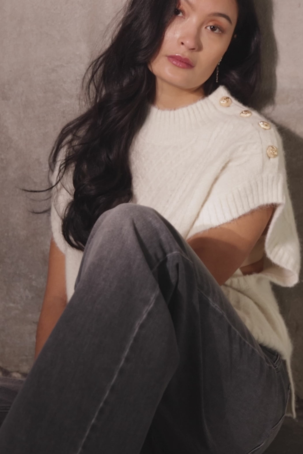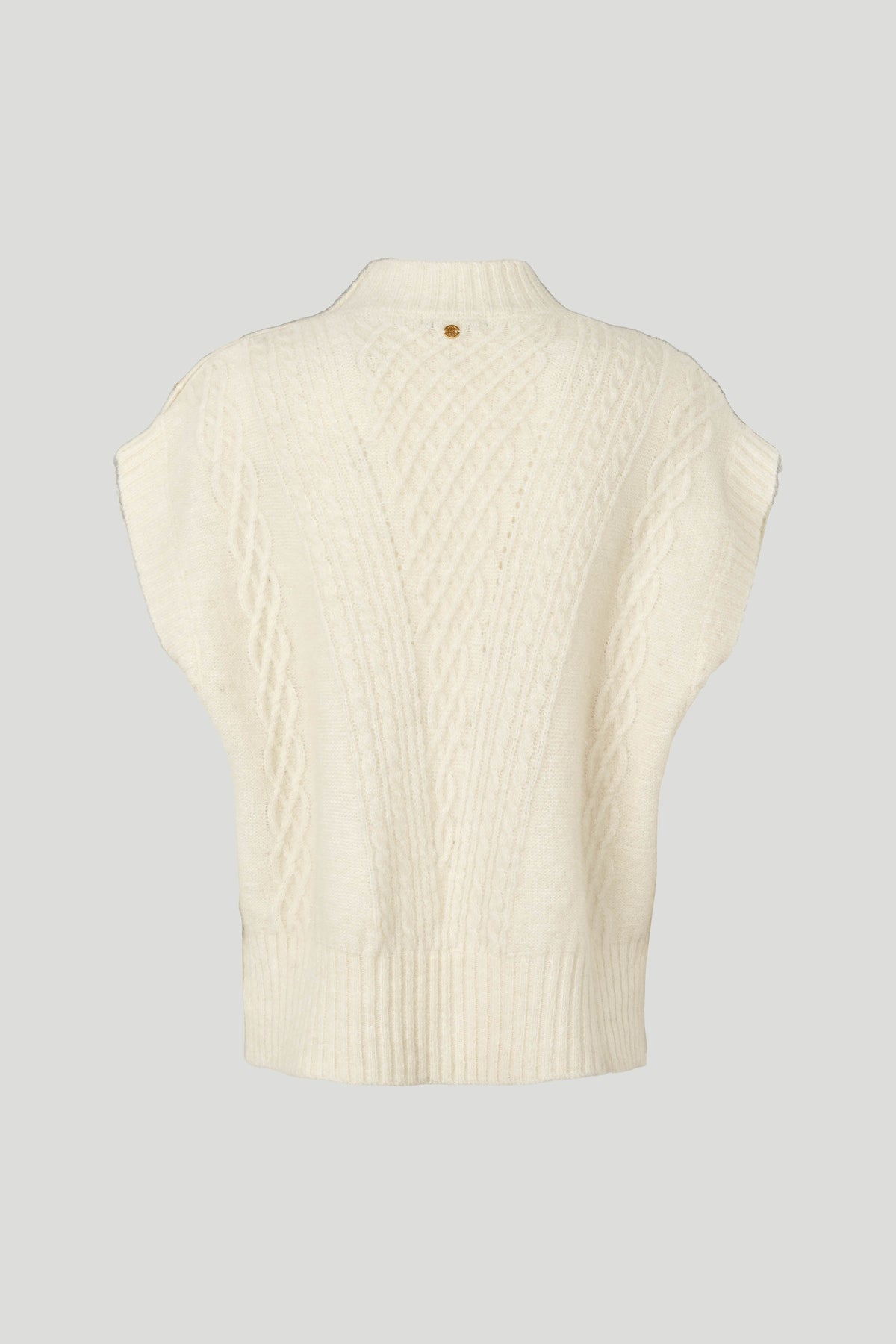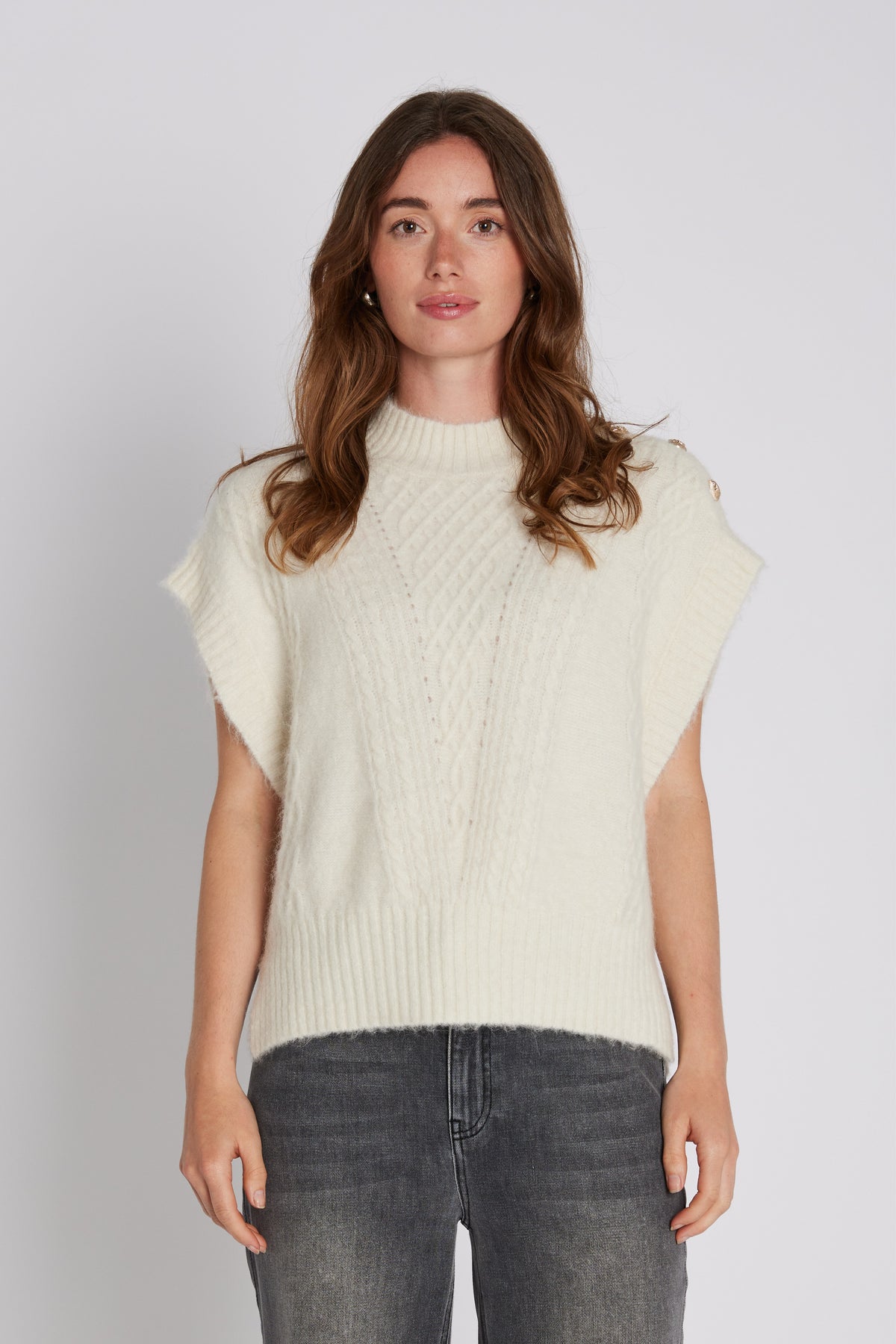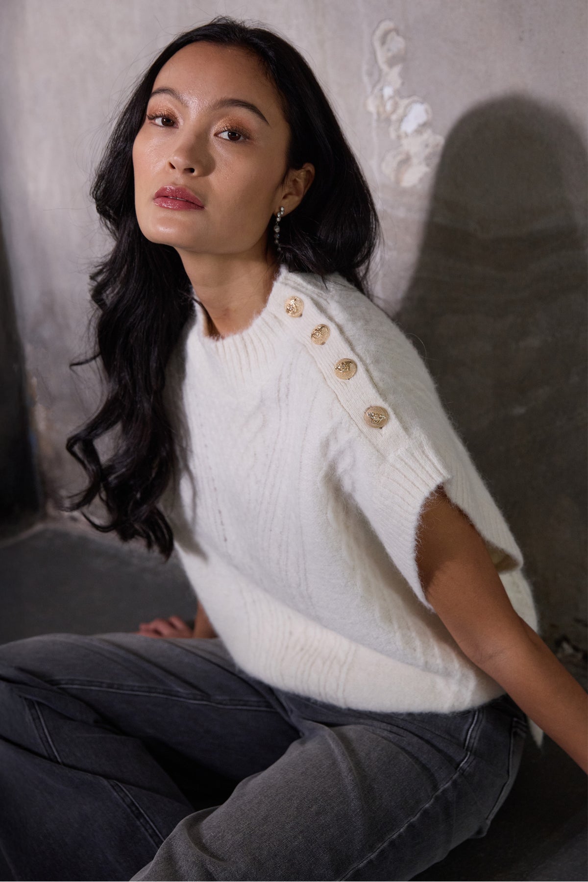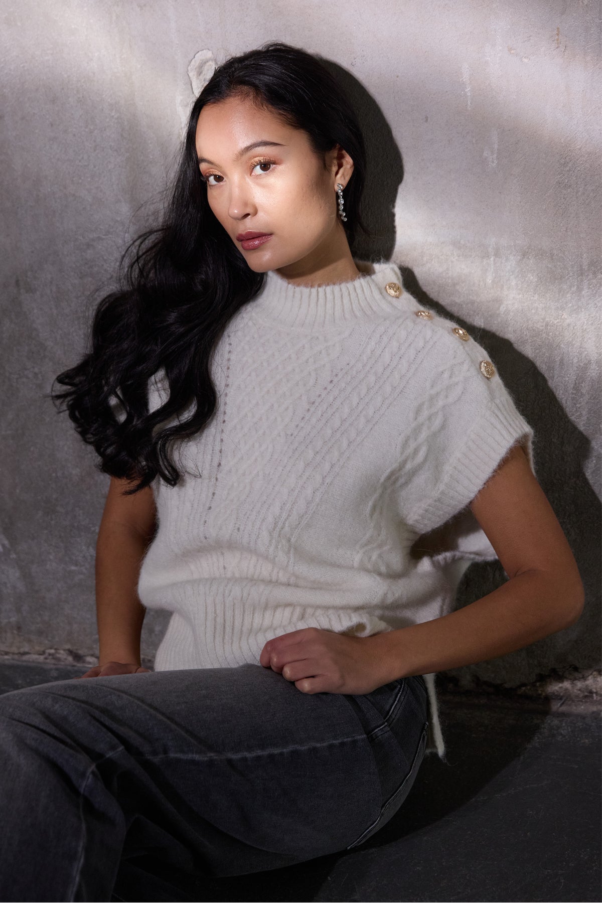 3428PBOAlino knit vest is a timeless vest in soft knit with classic cable knit and short sleeves. Decorative buttons on the shoulder add an elegant touch.