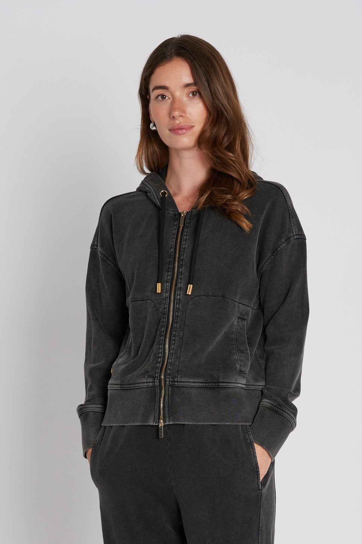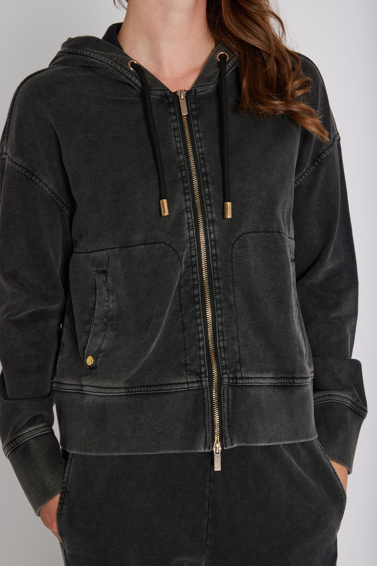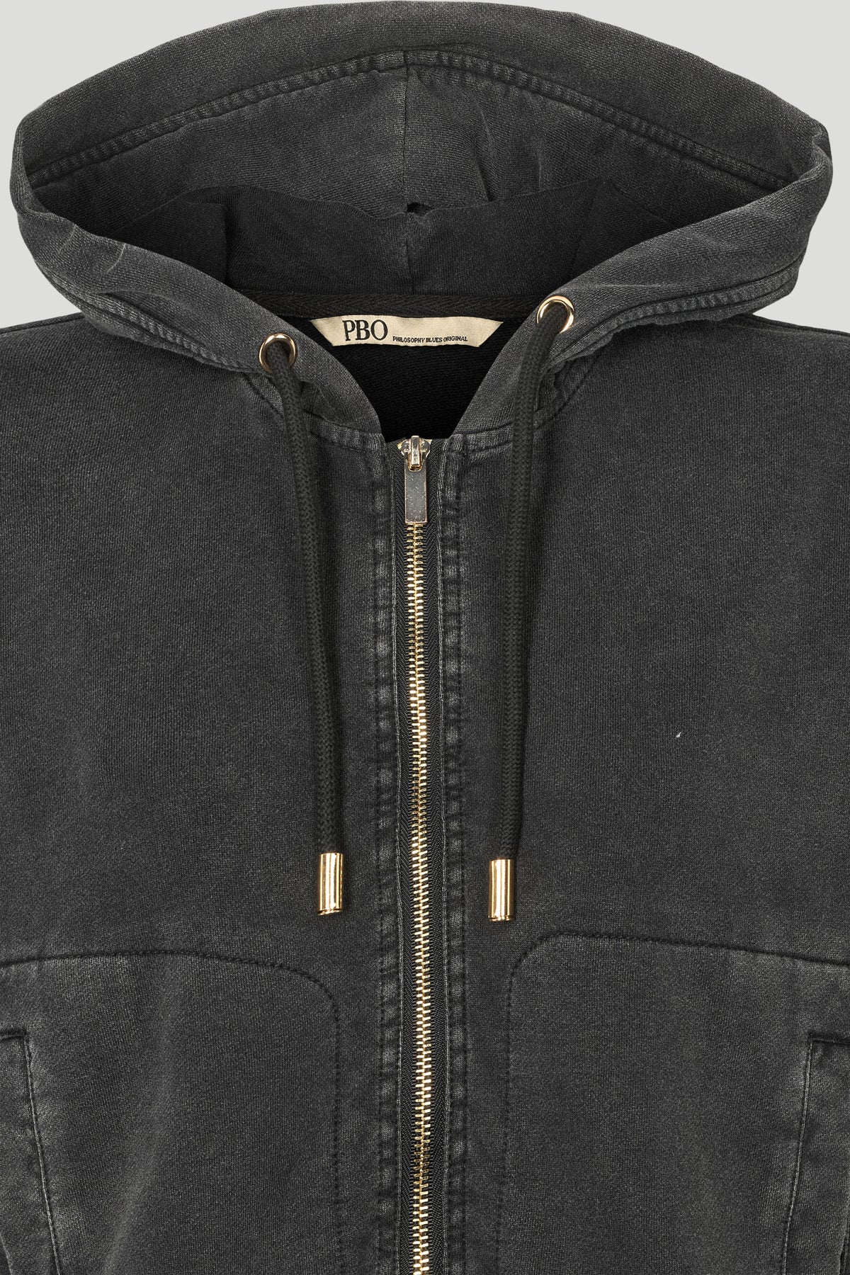 4376PBOKonjo hættetrøje har en afslappet, boxy pasform med gulddetaljer og tovejs-lynlås. Den vasket sorte farve og de strukturerede syninger giver et eksklusivt, sporty udtryk med et strejf af edge.