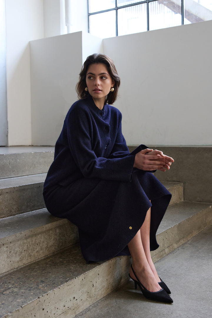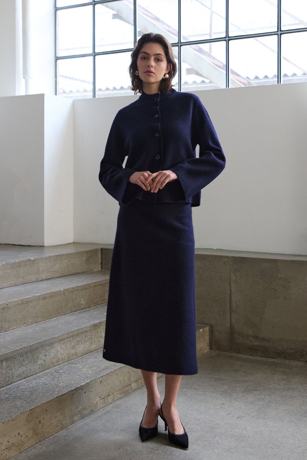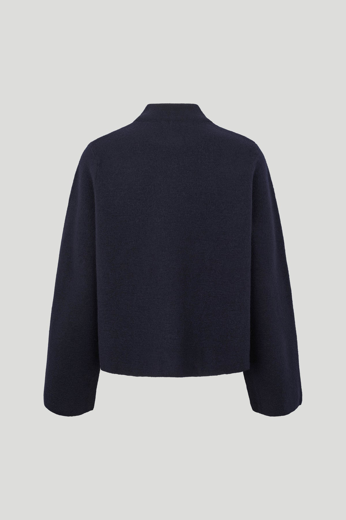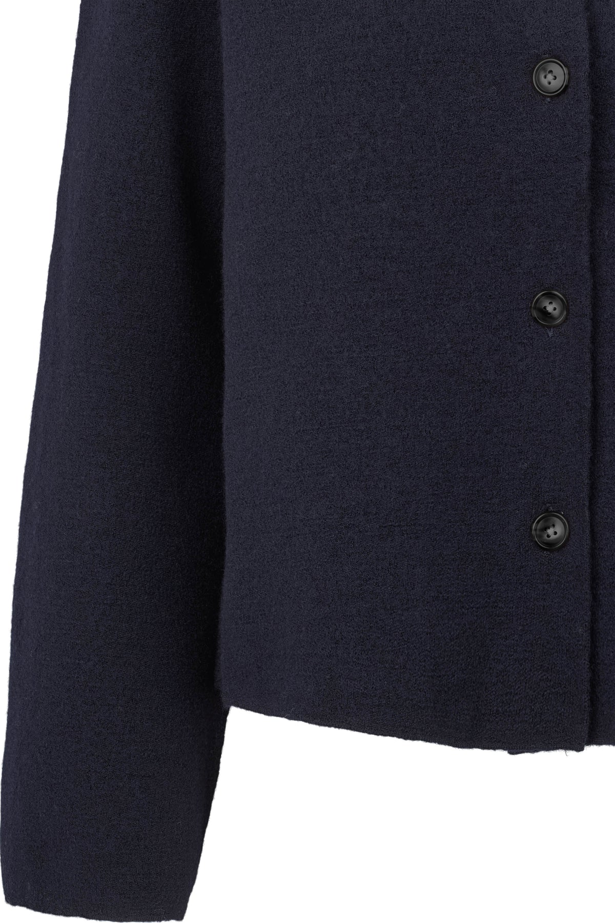 3425PBOMantraMeadow is a short cardigan with a stand-up collar, straight silhouette and front button closure. A simple and refined design for layering.