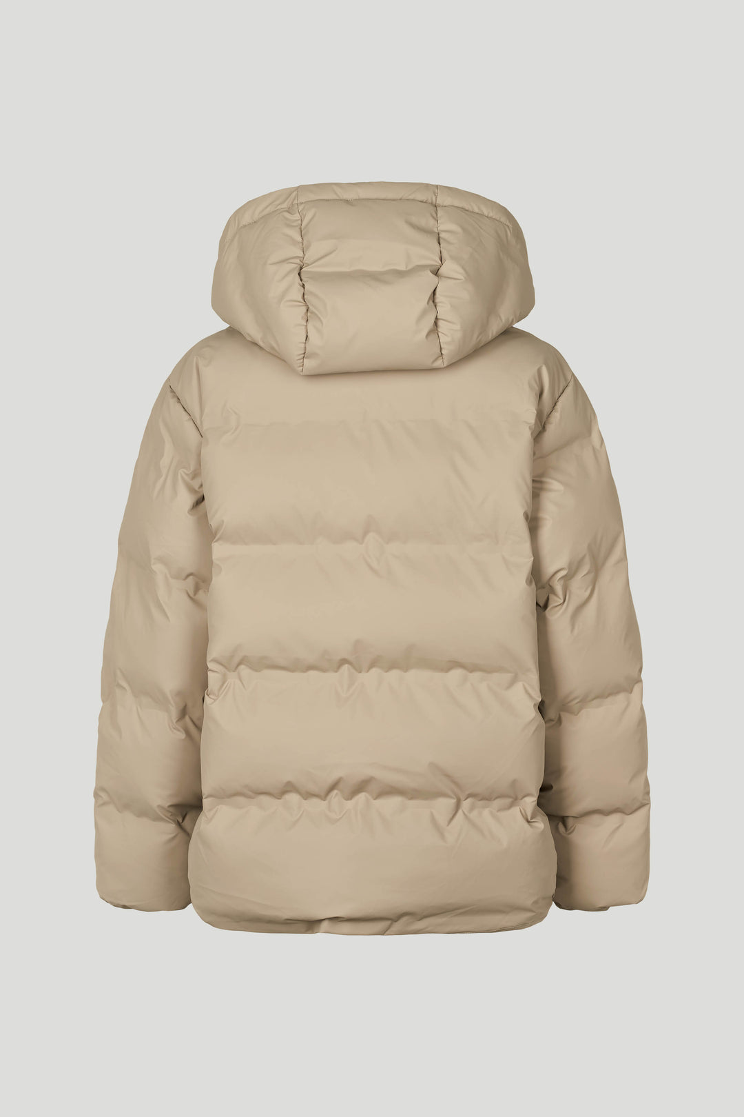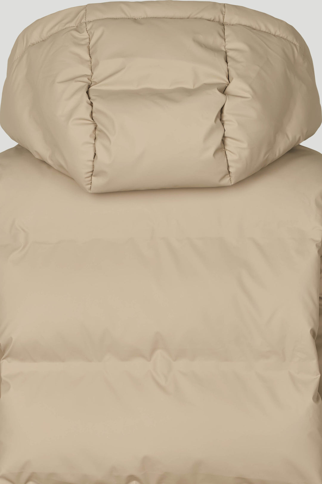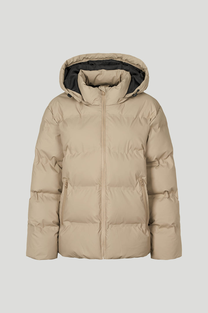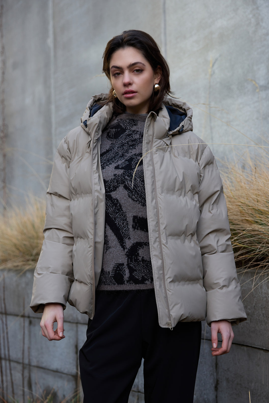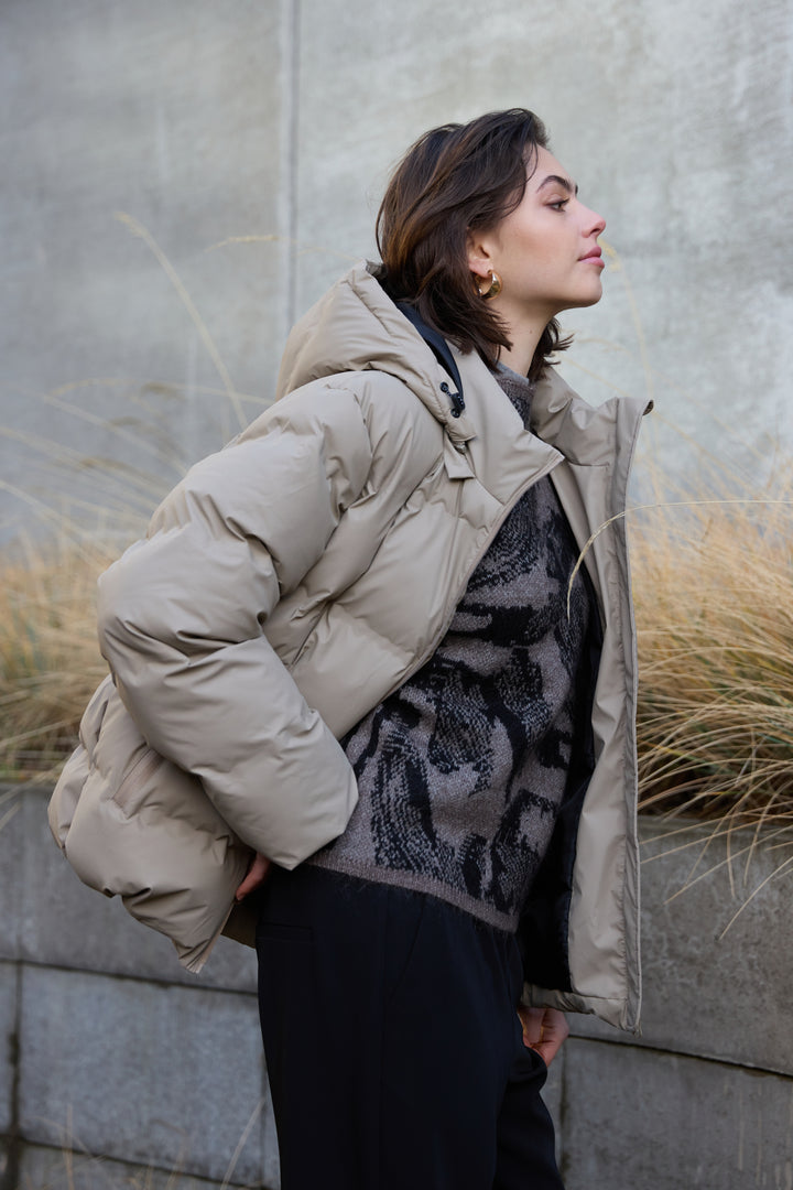 3556PBOVillano is a short down jacket with a hood, full-length zipper and a slightly curved silhouette. The model has a regular fit and a high collar.