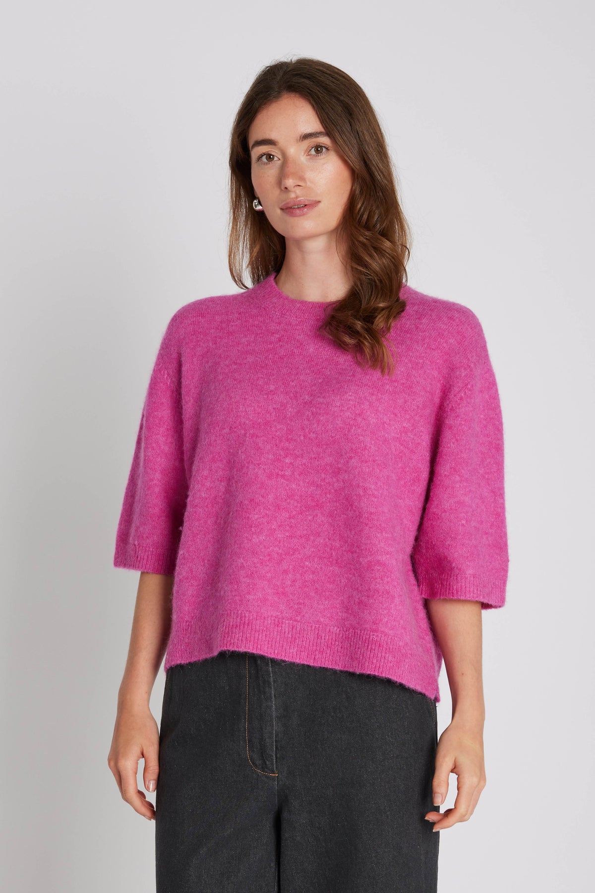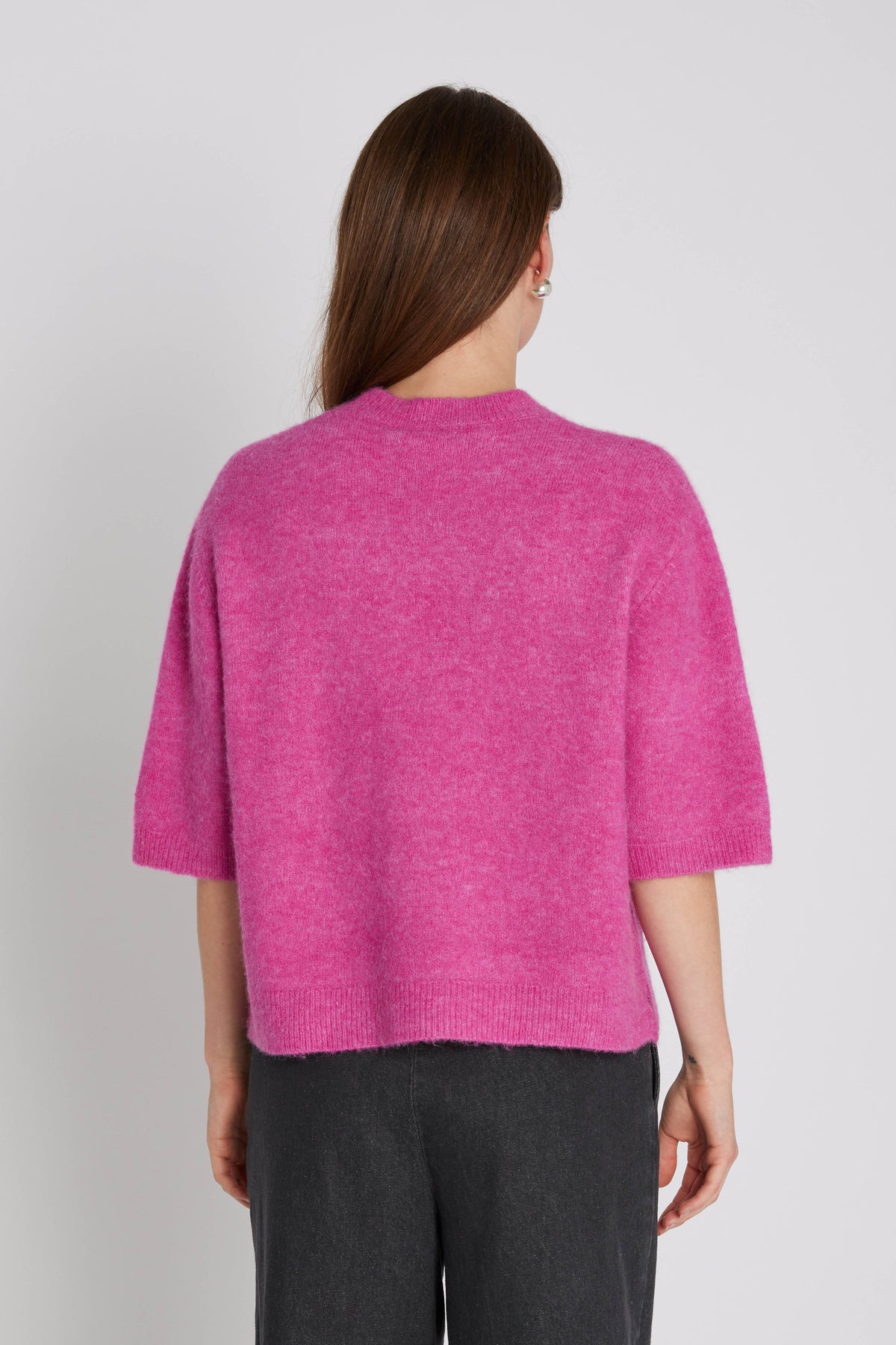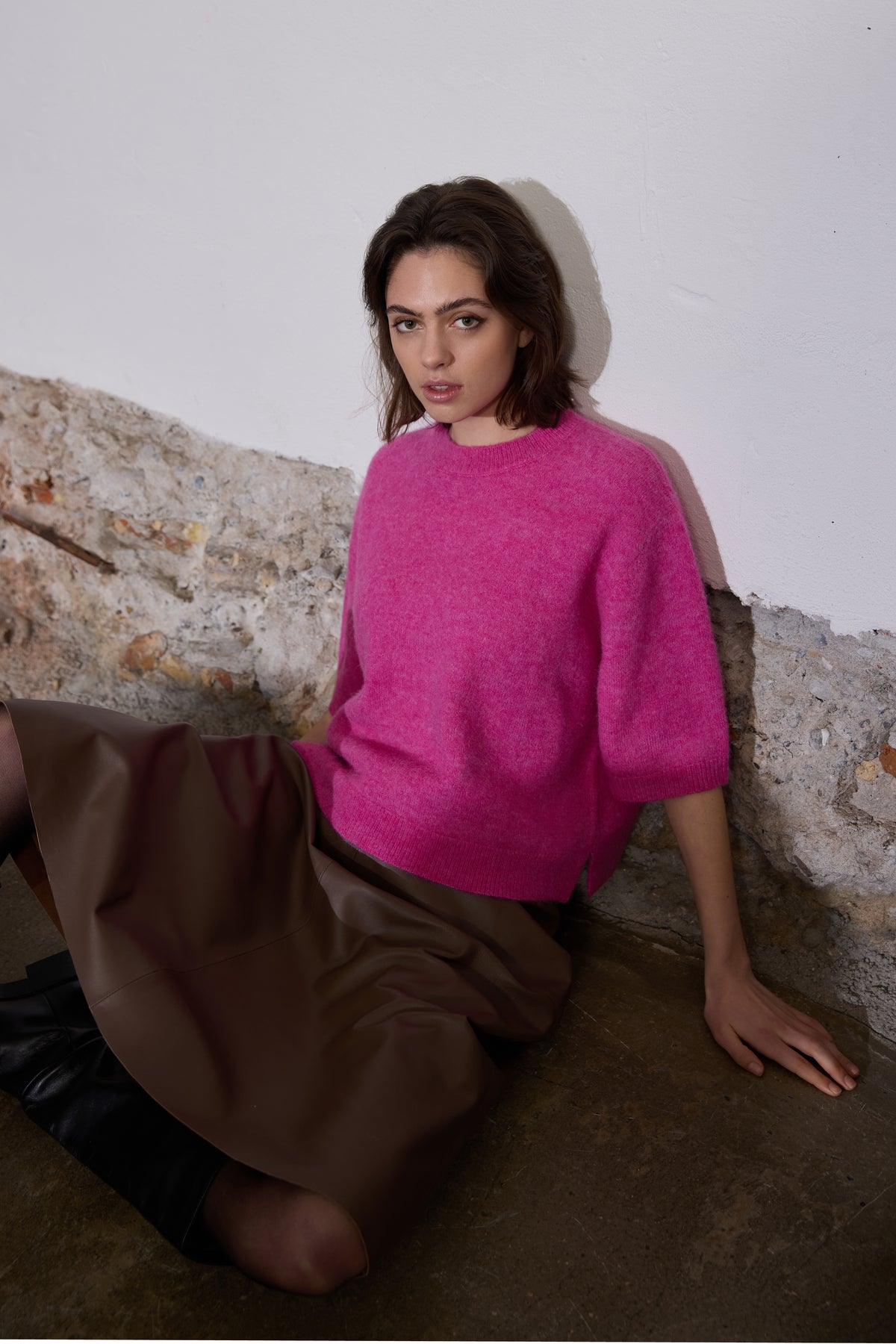 2421PBOKonto er en løs strik med rund hals og halvlange ærmer. Designet i en levende pink nuance, der tilføjer personlighed til ethvert look.