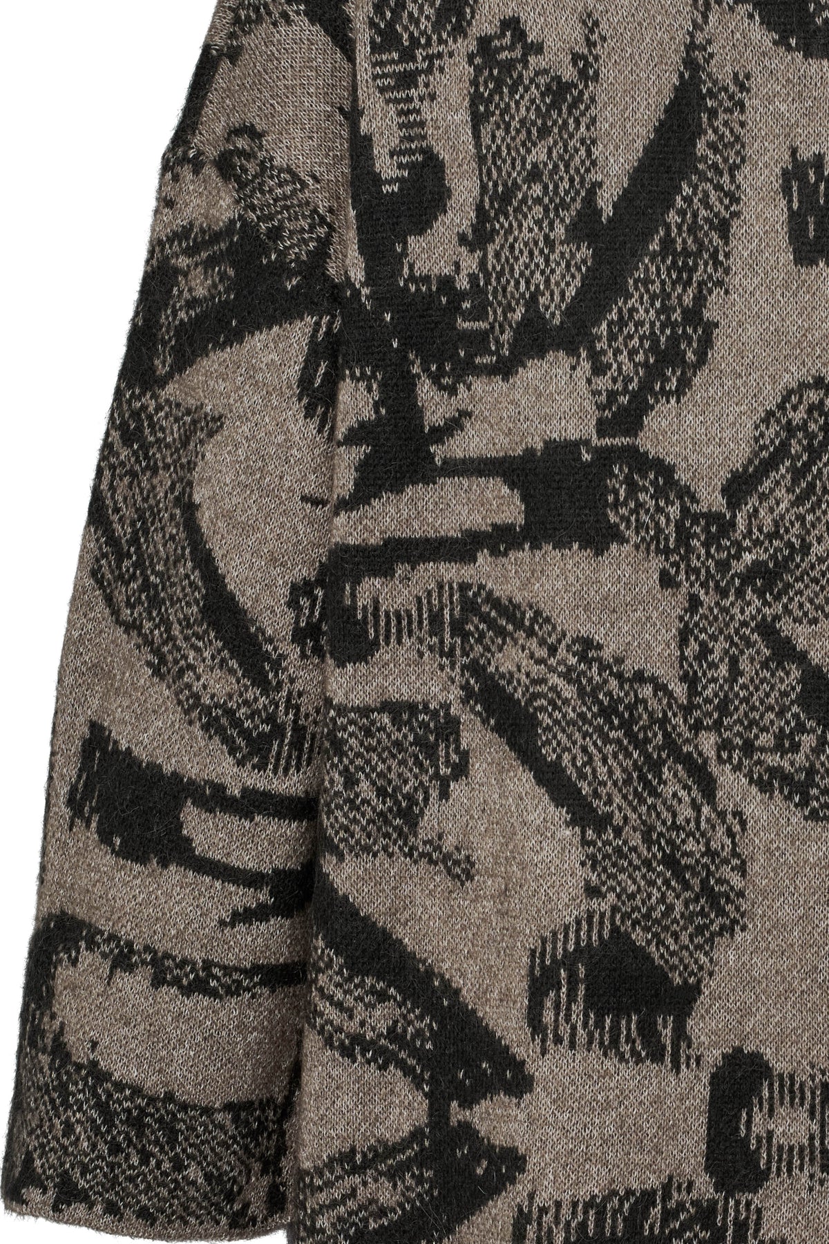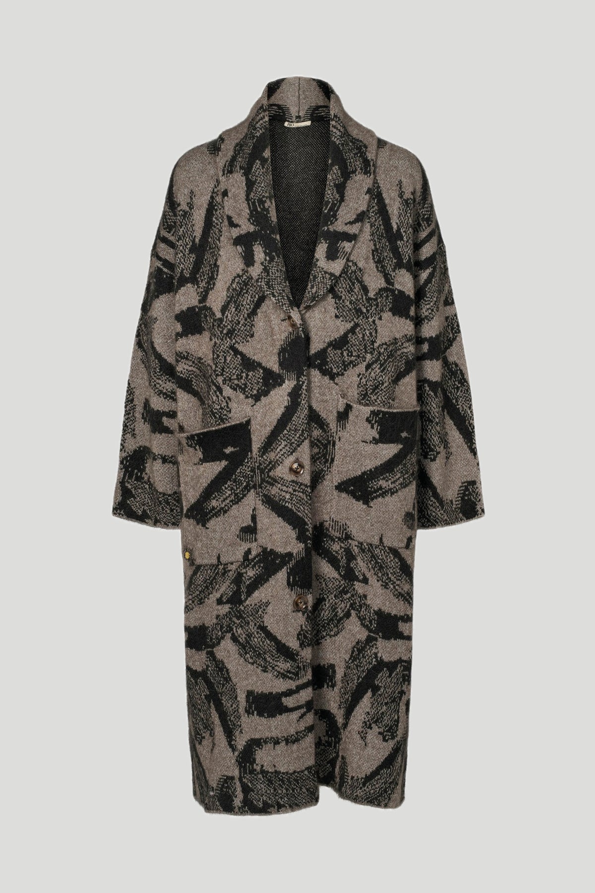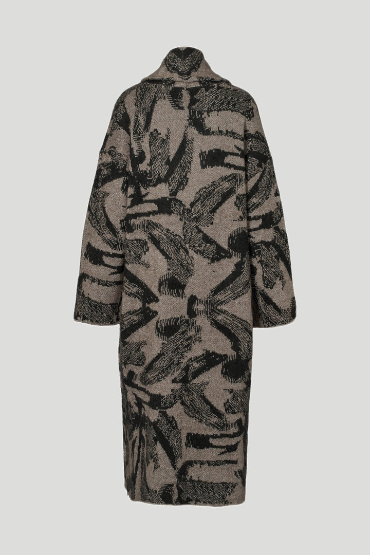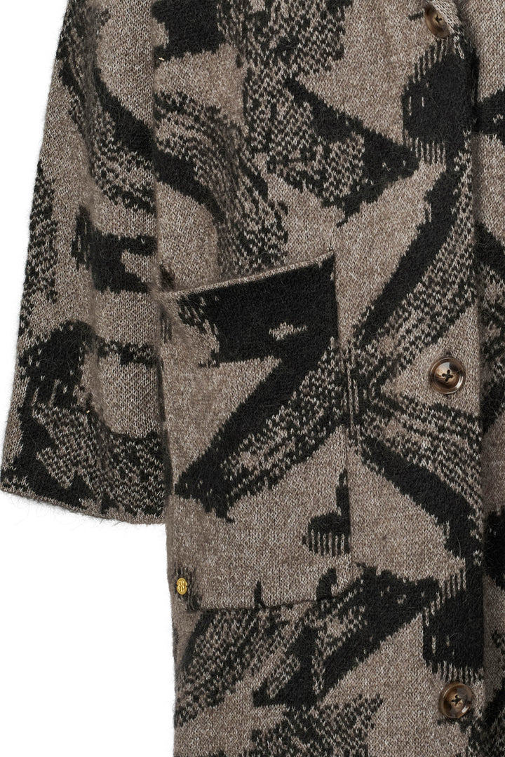 3422PBORita er en lang, strikket jakke med oversized pasform, sjalskrave og dekorativt, grafisk mønster. Perfekt til lag-på-lag looks.