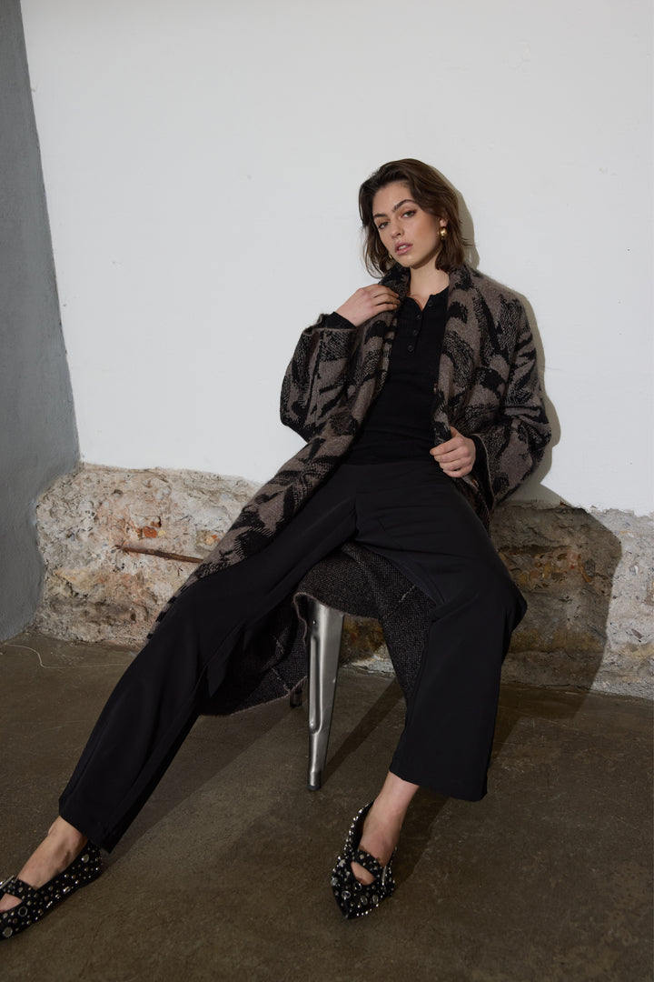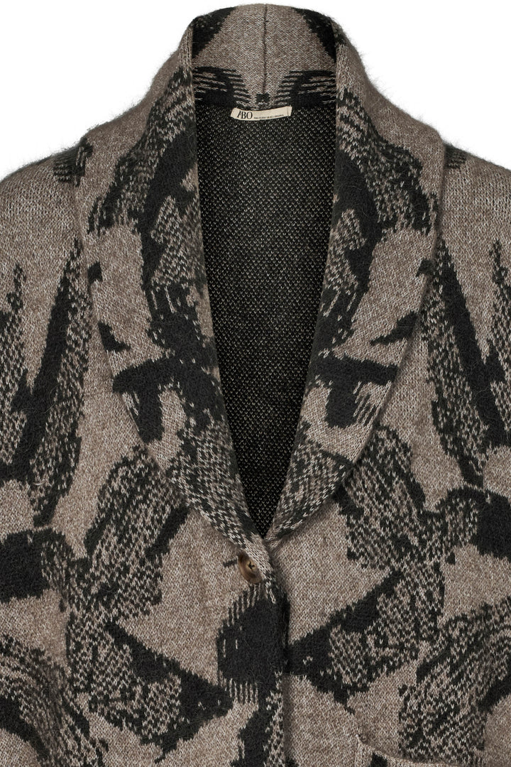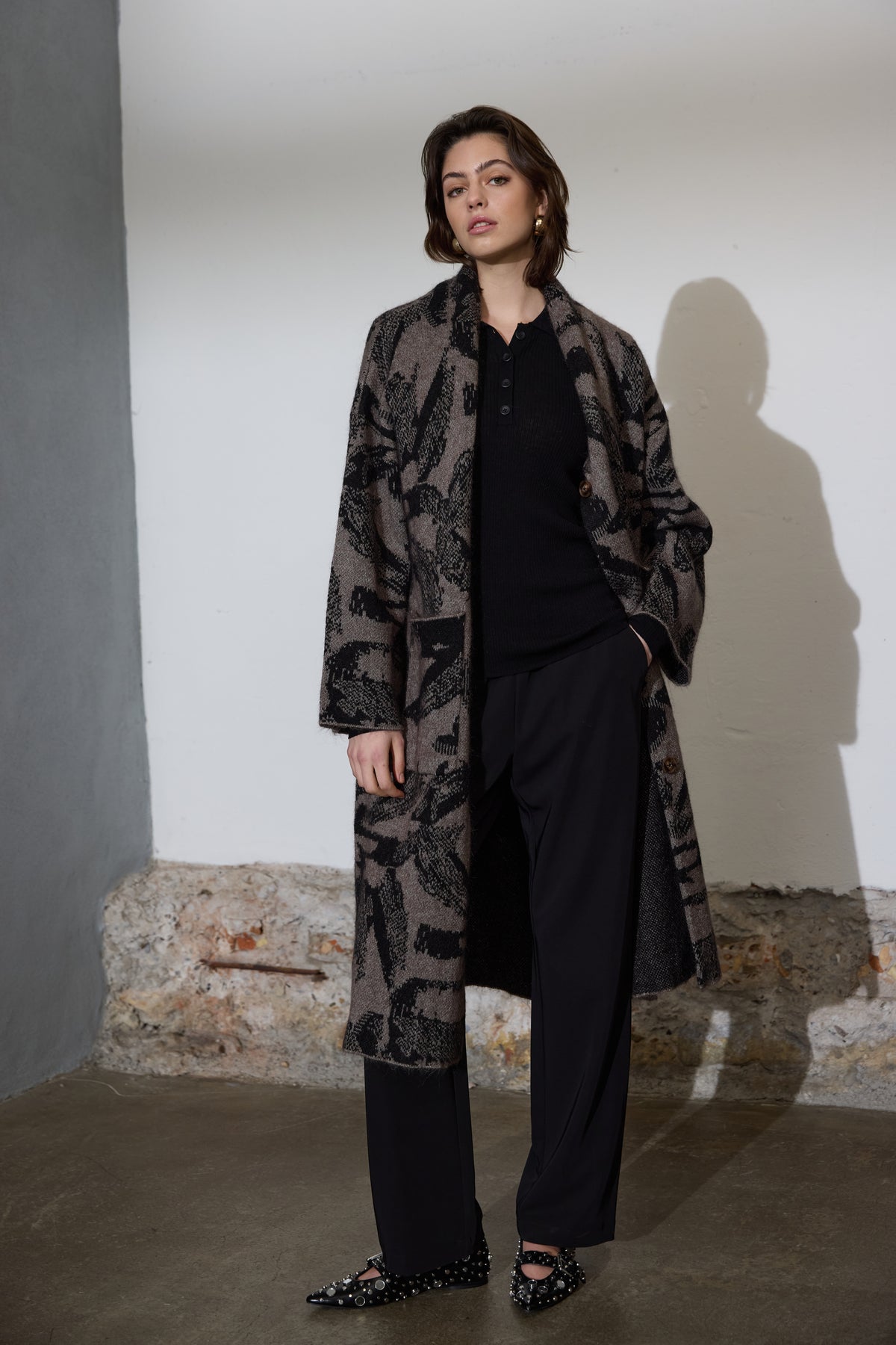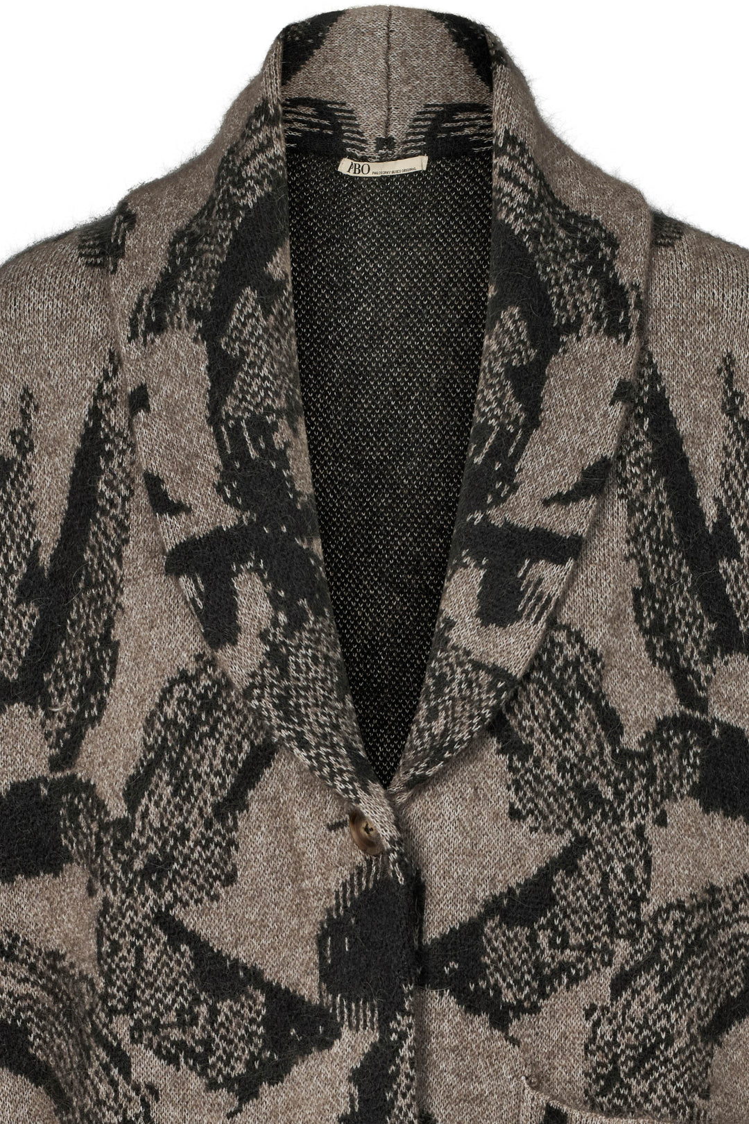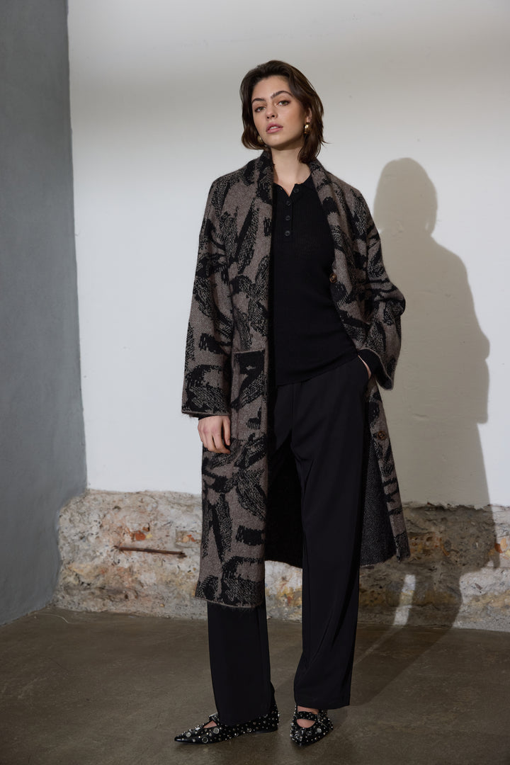 3422PBORita er en lang, strikket jakke med oversized pasform, sjalskrave og dekorativt, grafisk mønster. Perfekt til lag-på-lag looks.